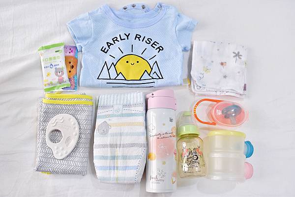 寶寶衣服一套、手帕、尿布、隔尿墊、衛生紙、濕紙巾、奶瓶、保溫瓶、奶嘴、奶粉罐、玩具