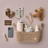 誰說推車置物袋不能很時尚?HAPP最新創作「推車置物袋」,不只功能要強大,時尚態度更要把關。延續了品牌標誌性人字形花紋,我們換上了專門為推車置物袋研發的加厚防潑水尼龍,不僅能讓袋體更加強韌挺立也更好擦拭。以細緻的立體縫合手法搭配緞面光澤面料,完美呈現與眾不同的時尚奢華感!袋內有三大空間與一個拉鍊隔層,能輕鬆放置各種需即時拿取的飲品與外出用品;而防滑束帶可牢牢固定於推車把手,容易拆卸、輕鬆外掛增加置物收納空間,並在兼具強大收納功能的同時,也為推車的外觀升級加分,隨時隨地展現外出時尚品味。一起當個時尚父母吧!